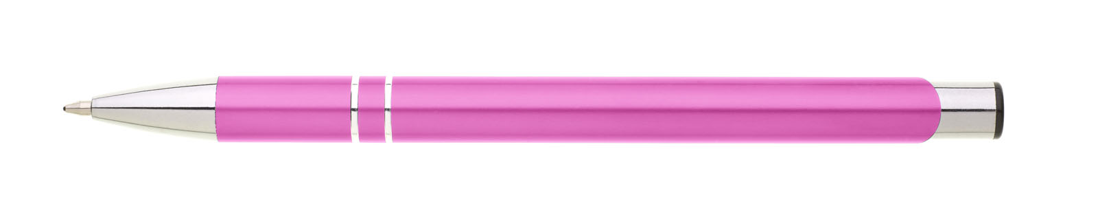 ALBA je velmi oblíbená hliníková reklamní tužka. Matné růžové tělo se dvěma stříbrnými proužky a chromovými doplňky. Velkoobsahová modrá náplň.