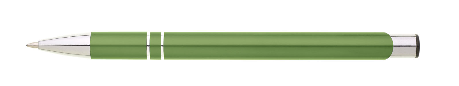 ALBA je velmi oblíbená hliníková reklamní tužka. Matné středně zelené tělo se dvěma stříbrnými proužky a chromovými doplňky. Velkoobsahová modrá náplň.