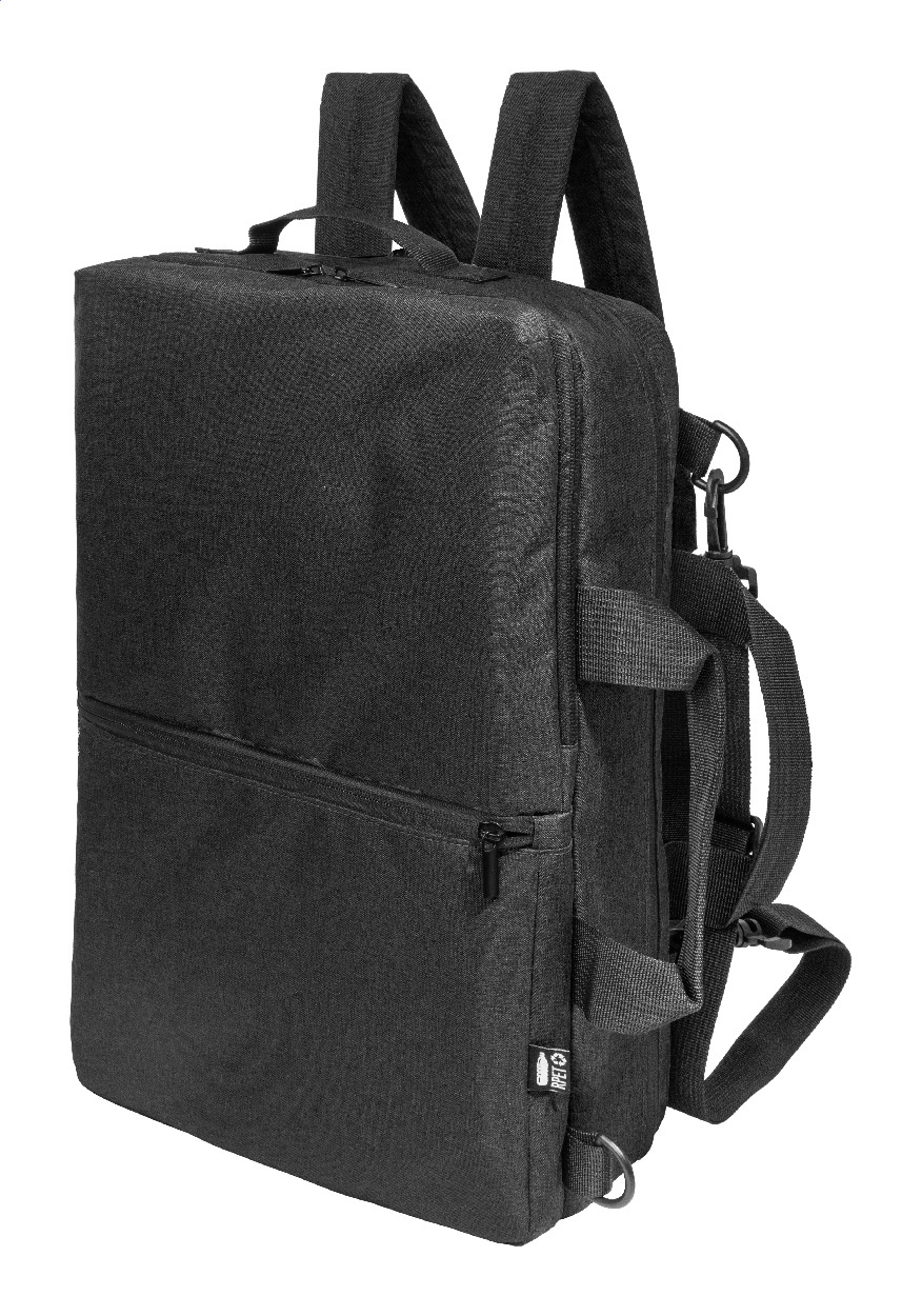 Dvojfunkční RPET batoh a taška na dokumenty s přihrádkou na zip, 2 předními kapsami na zip a polstrovanou přihrádkou na notebook (15"). S polstrovanými zády a ramenními popruhy. Součástí je i odnímatelný ramenní popruh pro použití jako taška na dokumenty. 600D RPET polyester s výrazným štítkem RPET.