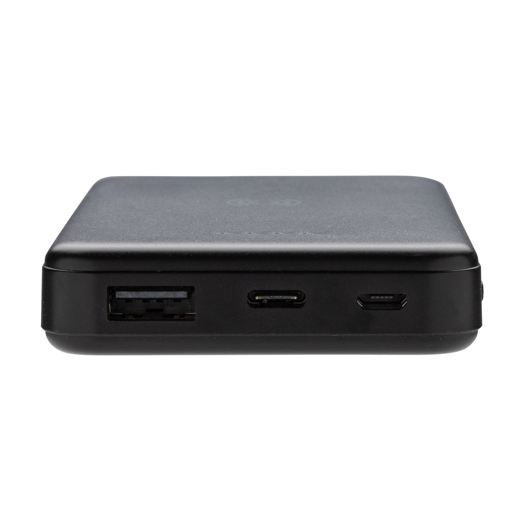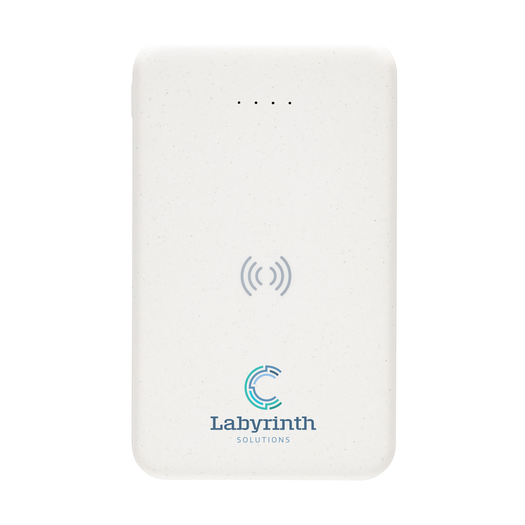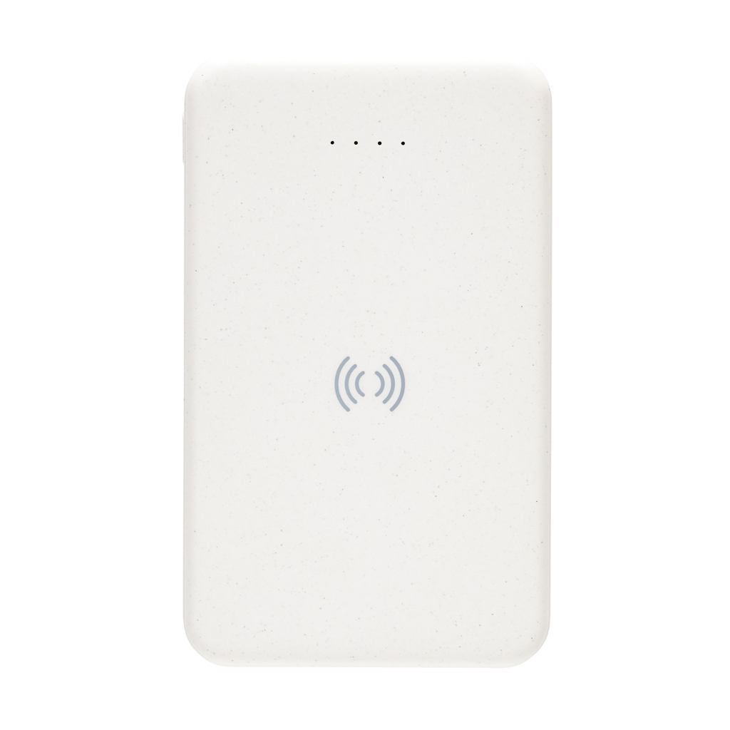 Bezdrátová 5W powerbanka s kapacitou 5 000 mAh vyrobená z recyklovaného ABS plastu s RCS certifikací. RCS (Recycled Claim Standard) je globální standard, který umožňuje ověřit použití recyklovaného materiálu v produktu napříč celým dodavatelským řetězcem. Celkový podíl recyklátu dle váhy produktu: 26 %. Kvalitní lithium polymerová baterie řady A s kapacitou 5 000 mAh plně nabije mobilní telefon až 2x. Světelné indikátory stupně nabití. Micro USB vstup: 5V/2A, USB C vstup: 5V/2,4A. USB A výstup: 5V/2,4A, USB C výstup: 5V/2A, bezdrátový výstup: 5W. Včetně nabíjecího kabelu z recyklovaného TPE. Výrobek je kompletně bez PVC. Baleno v FSC kraftové dárkové krabičce.