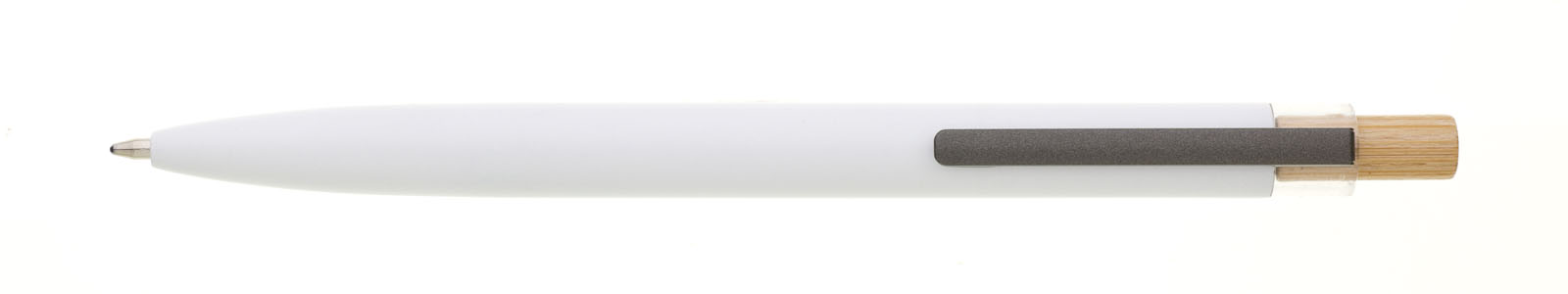 Bílá designová kovová propiska z recyklovaného hliníku. Tmavý kovový klip je uchycen v ozdobné transparentní koncovce, doplněné bambusovým klipem. Náplň velkoobsahová, modře píšící. Kolekce SAVE THE NATURE.