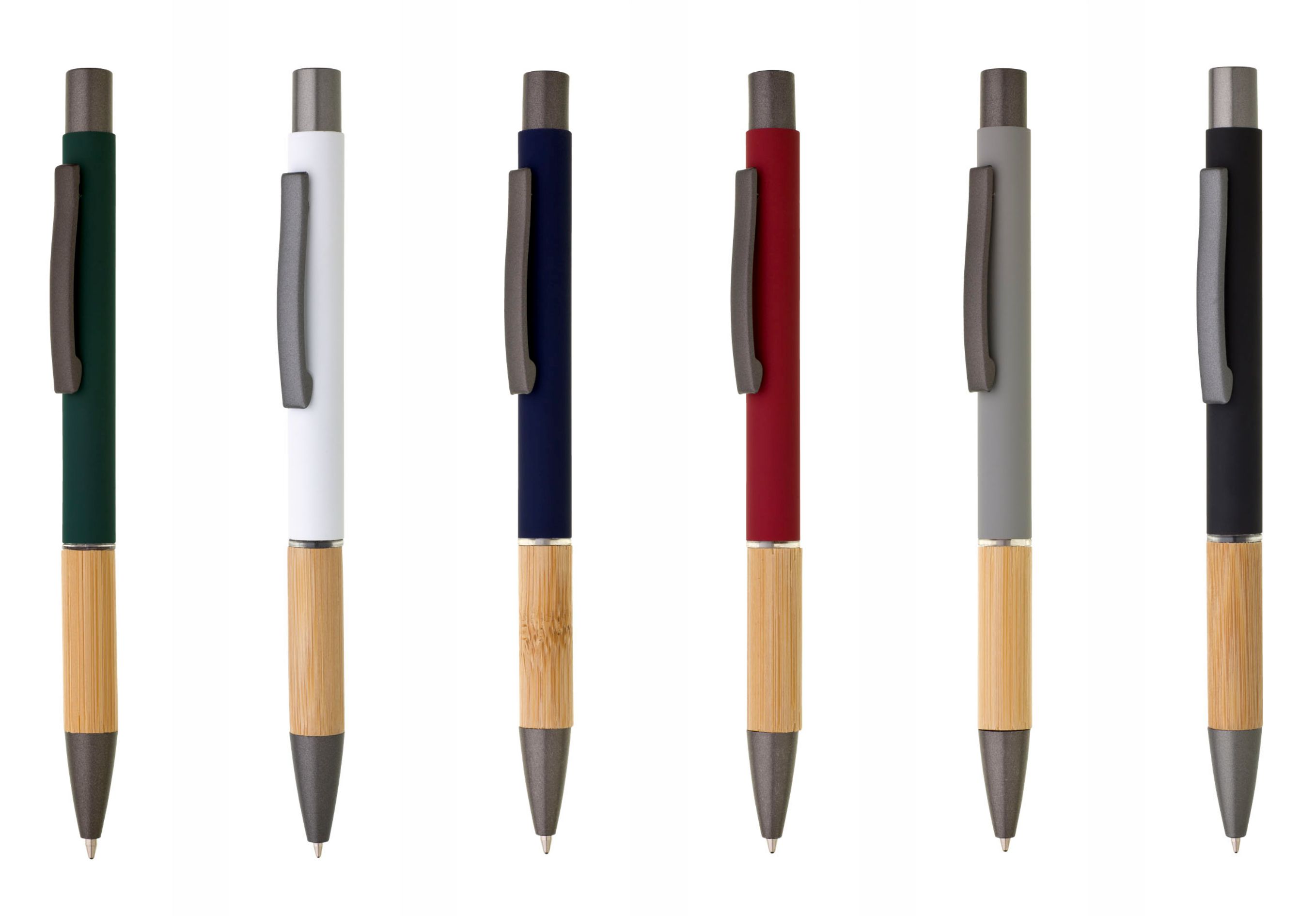 Kovová propiska s hnědo-černými doplňky, červeným pogumovaným potvrchem a bambusovým úchopem. Náplň X20 modře píšící. Kolekce SAVE THE NATURE.