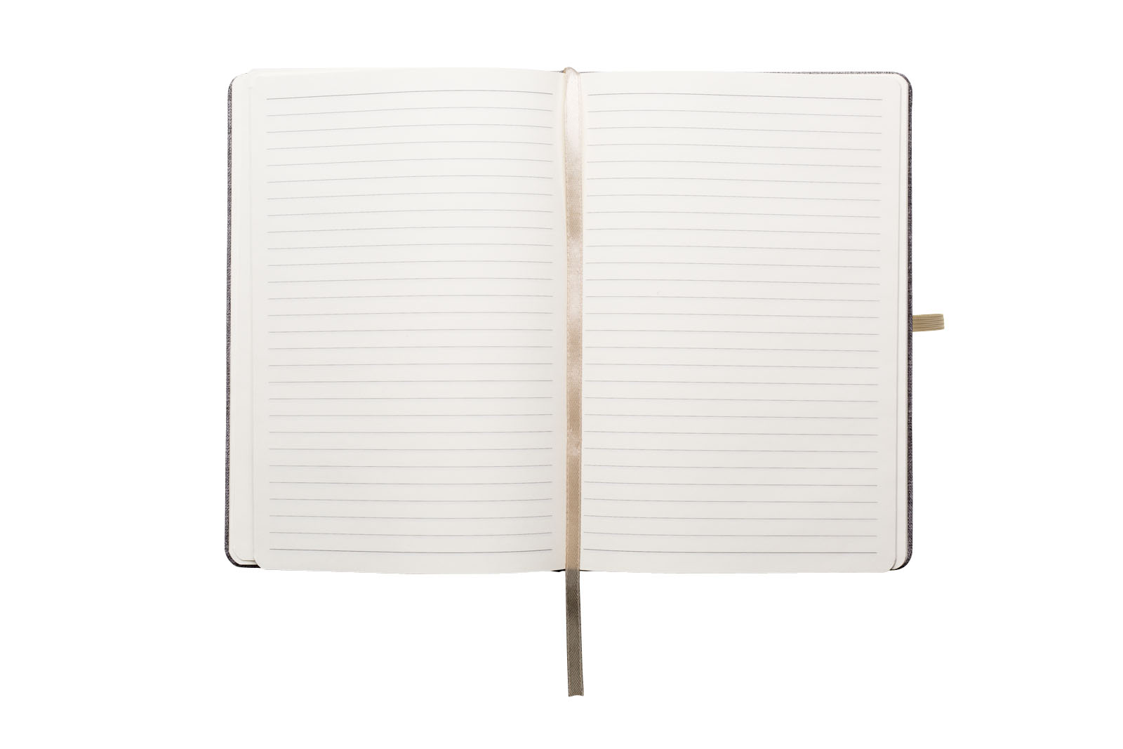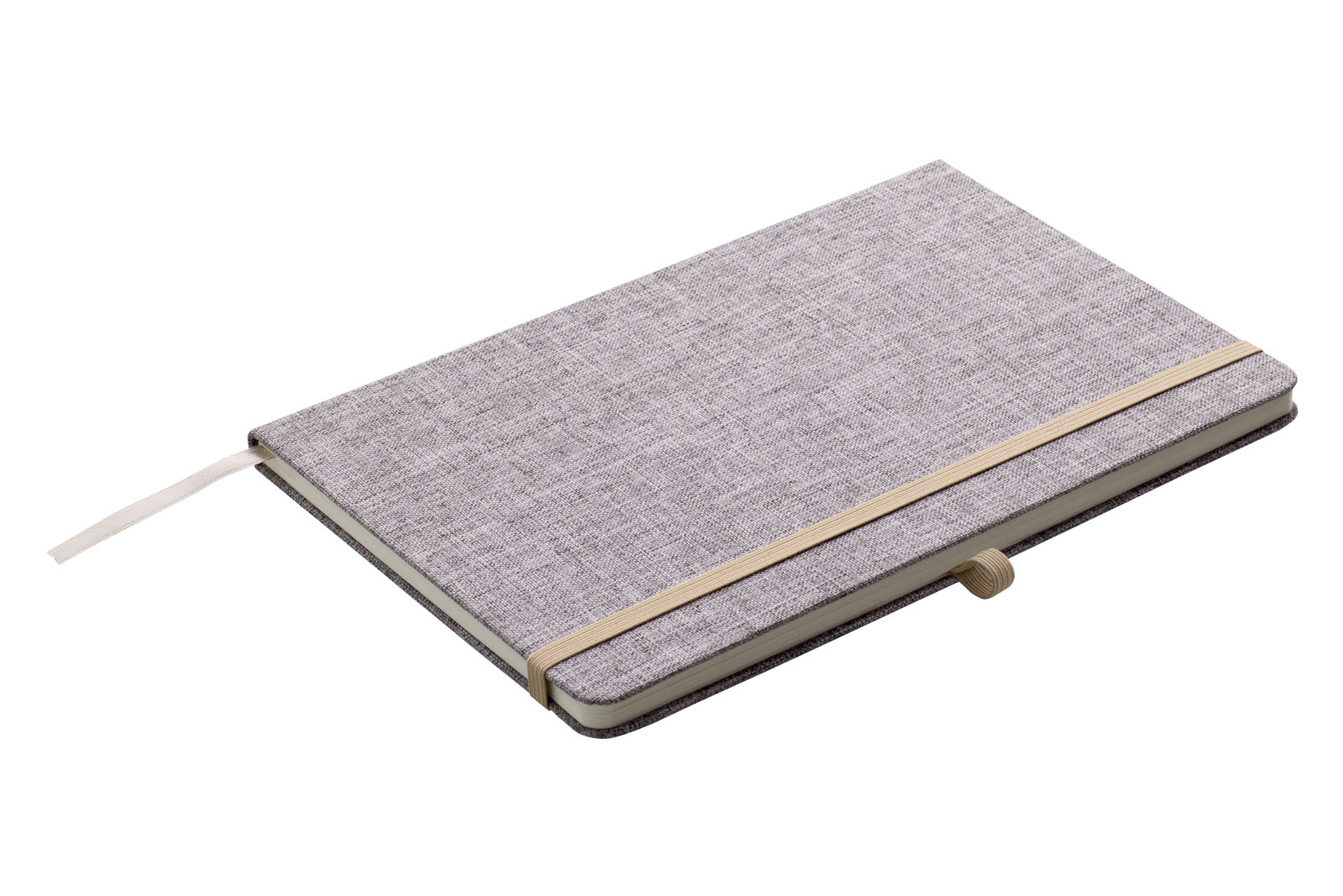 Zápisník A5 v deskách potažených šedou látkou z recyklované bavlny má 80 linkovaných listů. Blok má uzavírací gumičku, poutko na propisku a textilní záložku v přírodní barvě.