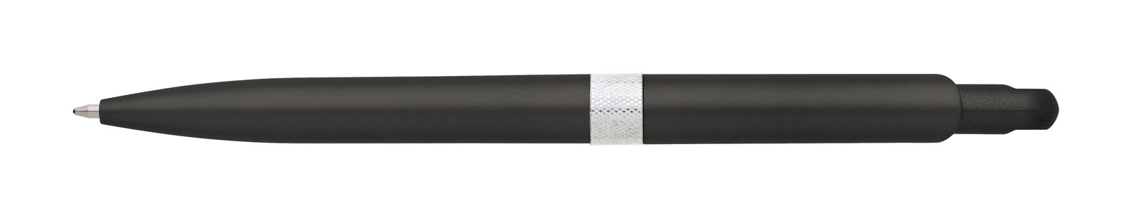 Plastové, kuličkové pero FIROL má černé, metalické tělo se stříbrným rýhovaným proužkem uprostřed. Náplň velkoobsahová, modře píšící. Kolekce DESIGN.