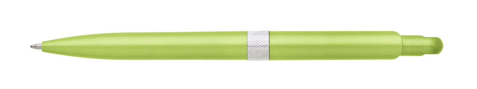 Plastové, kuličkové pero FIROL má světle zelené, metalické tělo se stříbrným rýhovaným proužkem uprostřed. Náplň velkoobsahová, modře píšící. Kolekce DESIGN.