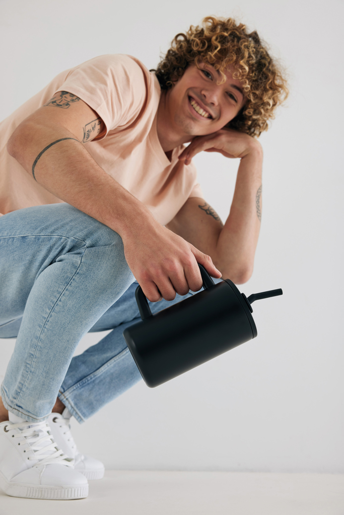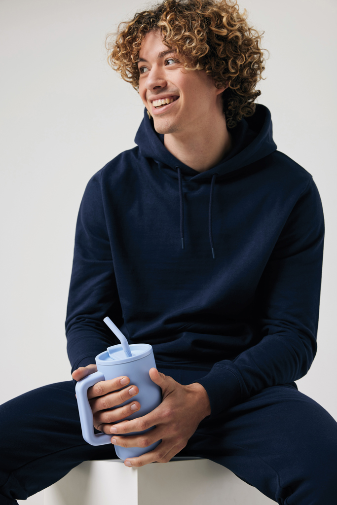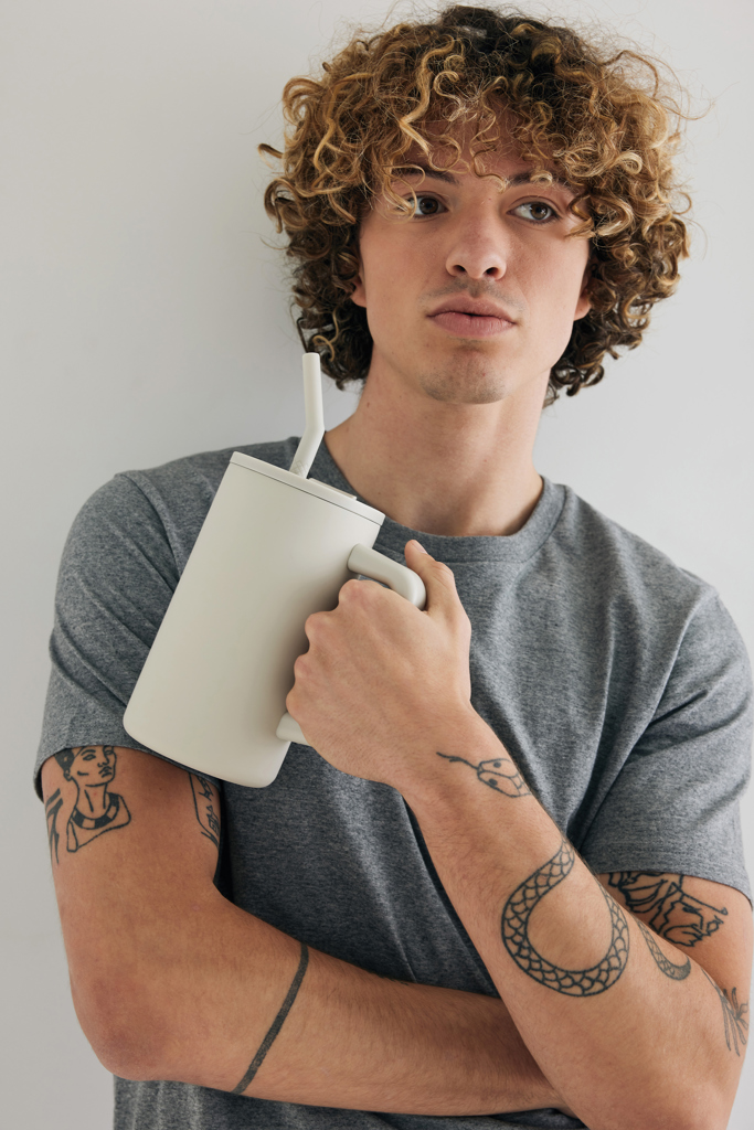 Jeho robustní rukojeť a široká základna z něj dělají ideálního společníka pro každodenní příjem tekutin v kanceláři. Mohutný, dvoustěnný, vakuově izolovaný hrnek je vybaven bezpečným víčkem, brčkem a silikonovou špičkou brčka. Šroubovací víko, které je dostatečně univerzální pro stáčení horkých i ledových nápojů, nabízí dvojí funkci – pohodlnou hubici na pití nebo možnost použití brčka. Hrnek je vyroben z odolné recyklované nerezové oceli. Doporučujeme mýt ručně.