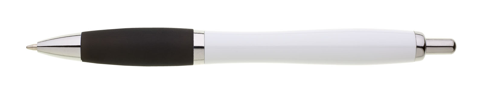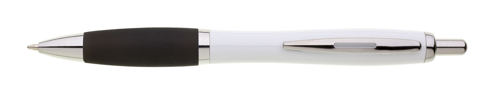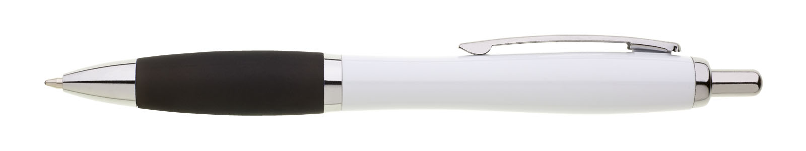 Plastové propisovací pero JESI s bílým tělem.Barva pogumovaného úchopu je černá. Ostatní doplňky jsou stříbrné. Náplň je velkoobsahová, modře píšící.