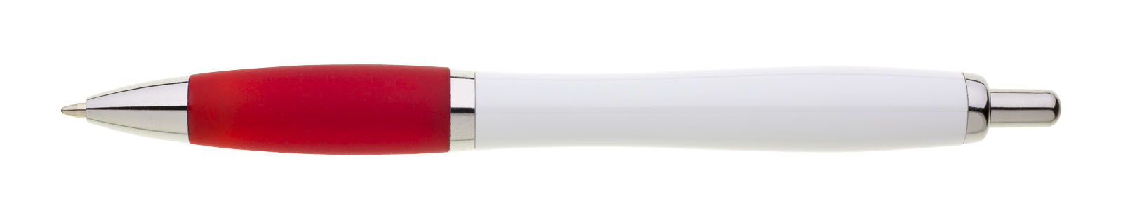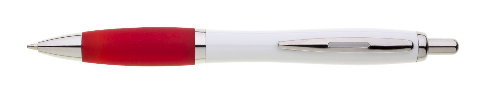 Plastové propisovací pero JESI s bílým tělem. Barva pogumovaného úchopu je červená. Ostatní doplňky jsou stříbrné. Náplň je velkoobsahová, modře píšící.