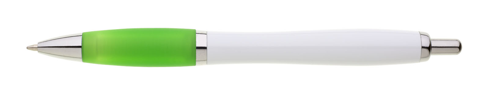 Plastové propisovací pero JESI s bílým tělem.Barva pogumovaného úchopu je světle zelená. Ostatní doplňky jsou stříbrné. Náplň je velkoobsahová, modře píšící.