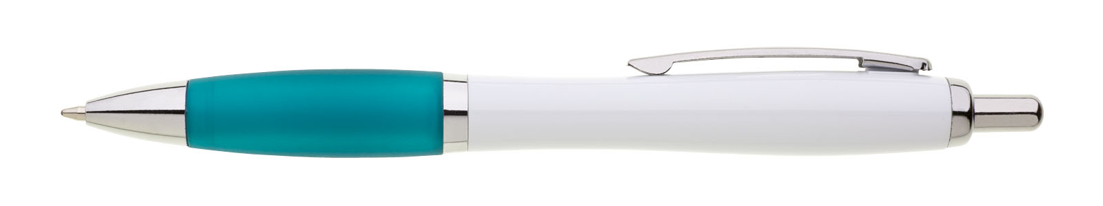 Plastové propisovací pero JESI s bílým tělem. Barva pogumovaného úchopu je tyrkysová. Ostatní doplňky jsou stříbrné. Náplň je velkoobsahová, modře píšící.