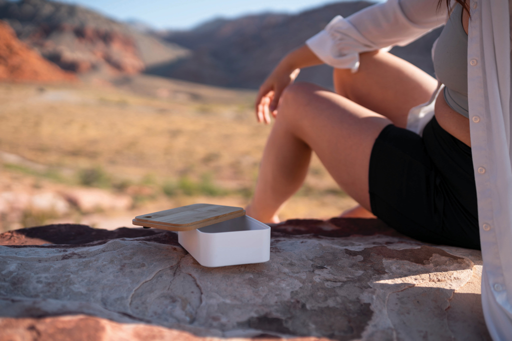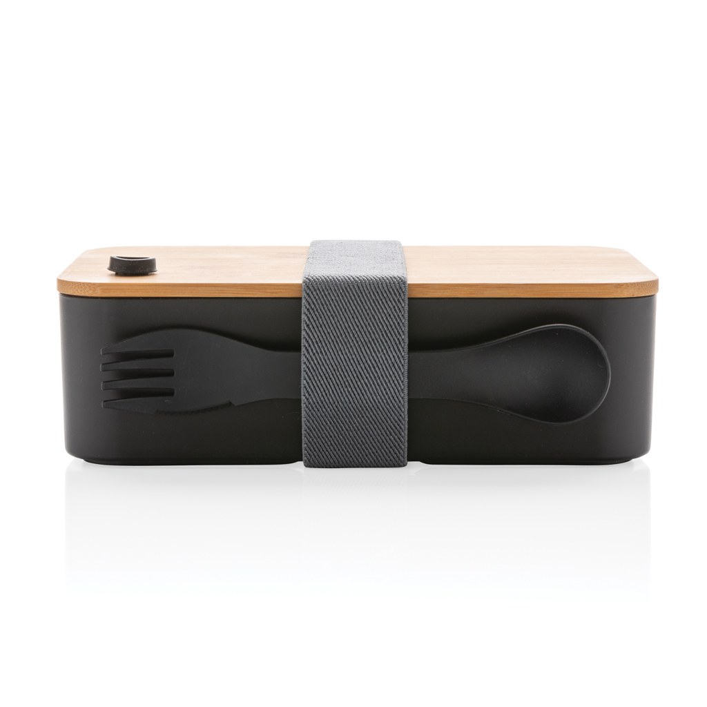 Praktická krabička na jídlo pro každodenní použití. Krabička je vyrobená z RCS recyklovaného PP plastu. RCS (Recycled Claim Standard) je globální standard, který umožňuje ověřit použití recyklovaného materiálu v produktu napříč celým dodavatelským řetězcem. Celkový podíl recyklátu dle váhy produktu: 44 %. Víko vyrobeno z přírodního bambusu. Krabička (bez víka) je vhodná do myčky nádobí i mikrovlnné trouby. Včetně elastické gumičky a příboru 3 v 1. Objem: 1,4 l. Baleno v FSC® kraftové dárkové krabičce.