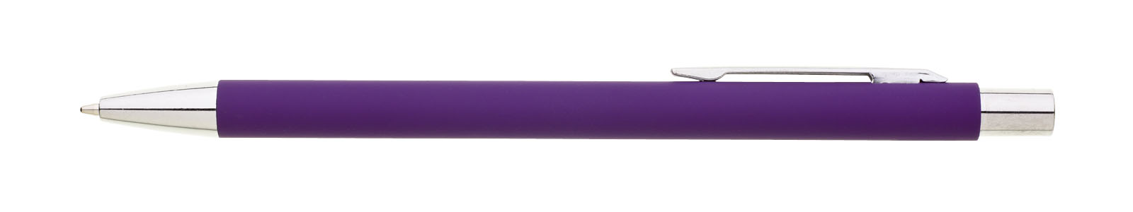 Tenká, jednoduchá propiska s fialovým pogumovaným tělem a chromovými doplňky. Náplň X20, modře píšící.