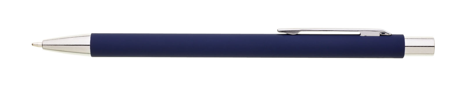Tenká, jednoduchá propiska s tmavě modrým pogumovaným tělem a chromovými doplňky. Náplň X20, modře píšící.