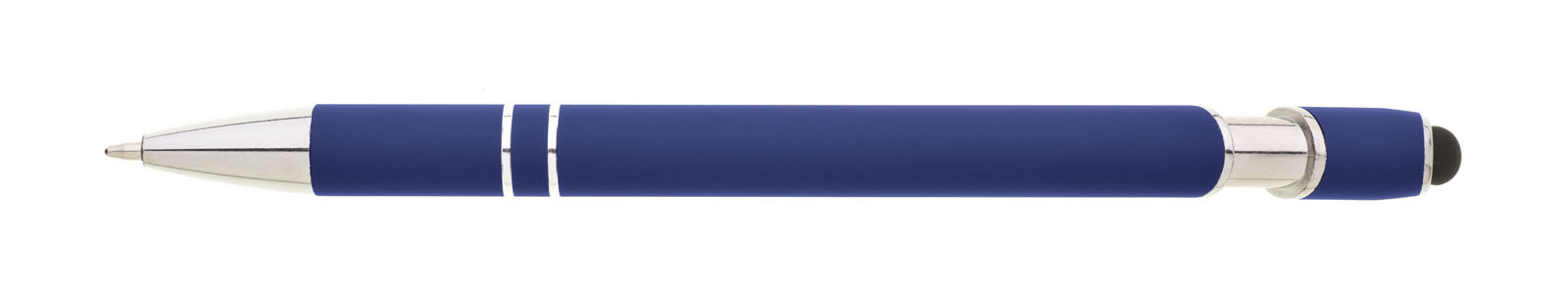 Propiska s touch koncem, měkkým pogumovaným povrchem soft v modré barvě a stříbrnými doplňky včetně dvou ozdobných kroužků. (NATIO)