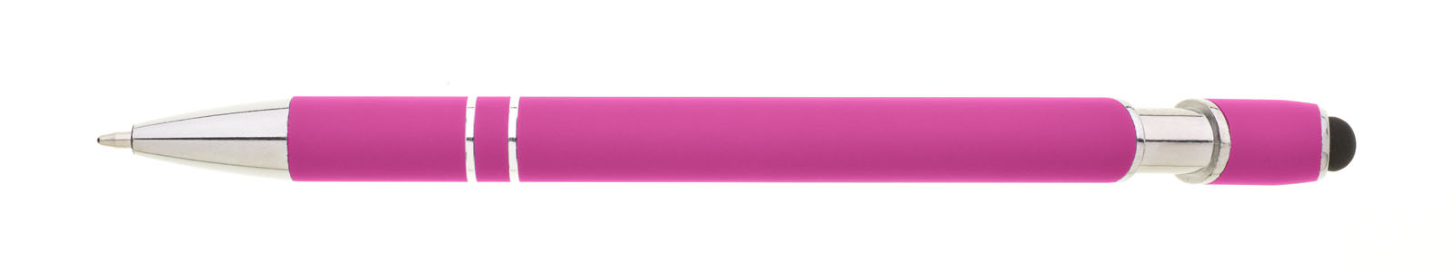 Propiska s touch koncem, měkkým pogumovaným soft povrchem ve růžové barvě a stříbrnými doplňky včetně dvou ozdobných kroužků. (NATIO)