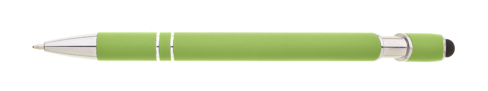 Propiska s touch koncem, měkkým pogumovaným soft povrchem ve světle zelené barvě a stříbrnými doplňky včetně dvou ozdobných kroužků. (NATIO)