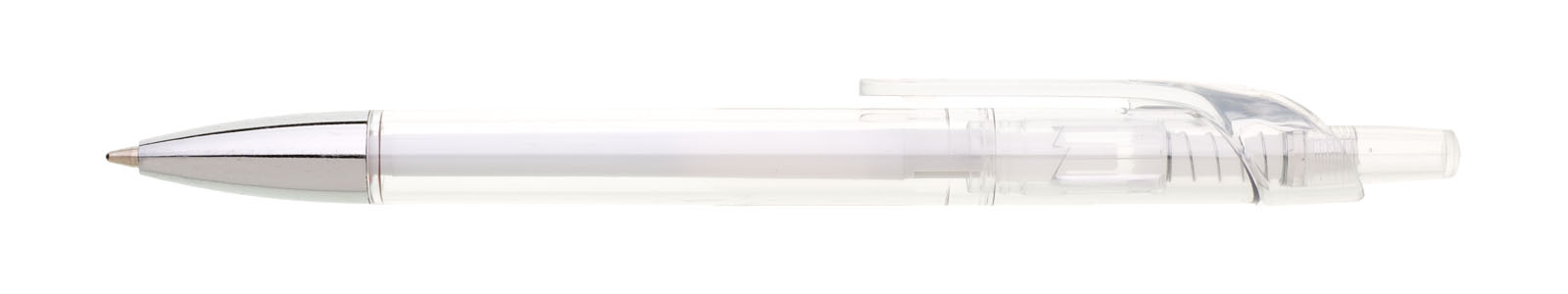 Plastová propiska NODO bílá, její tělo i klip je z průhledného plastu, jen špička pera je z pochromovaná. Náplň velkoobsahová, modře píšící náplň. K propisce je dodávána nová náhradní náplň, negarantujeme psaní originální náplně.