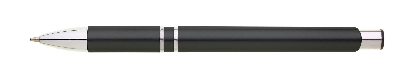 Plastové propisovací pero OIRA - černé. Pero je zdobené dvěma stříbrnými proužky. Na těle je zdobeno oválným výřezem. Pero má náplň velkoobsahovou, modře píšící.
