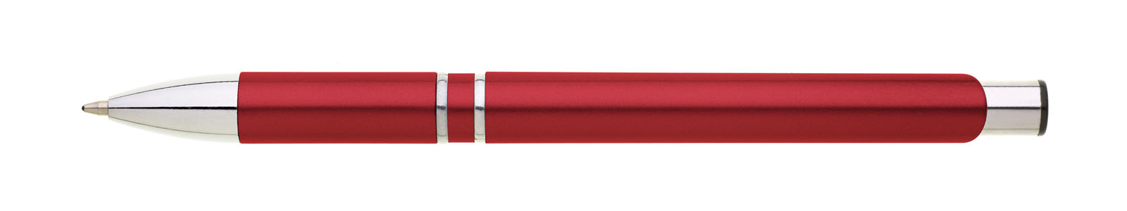 Plastové propisovací pero OIRA - červené. Pero je zdobené dvěma stříbrnými proužky. Na těle je zdobeno oválným výřezem. Pero má náplň velkoobsahovou, modře píšící.