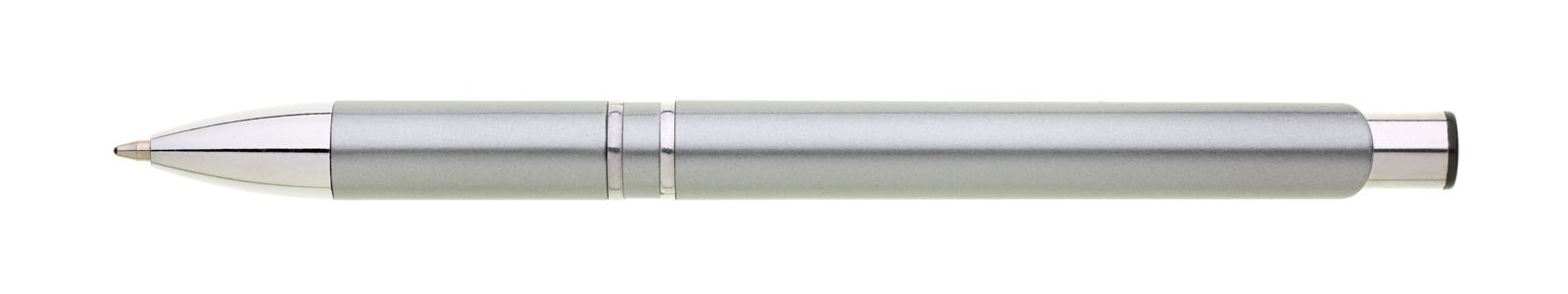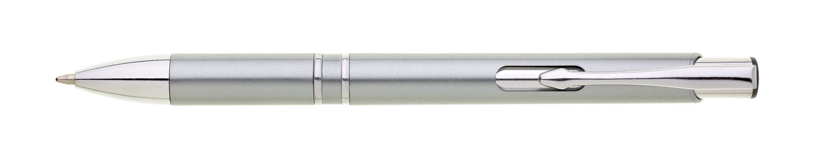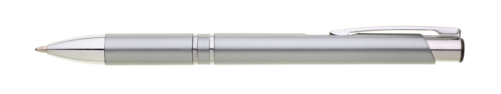 Plastové propisovací pero OIRA - stříbrné. Pero je zdobené dvěma stříbrnými proužky. Na těle je zdobeno oválným výřezem. Pero má náplň velkoobsahovou, modře píšící.