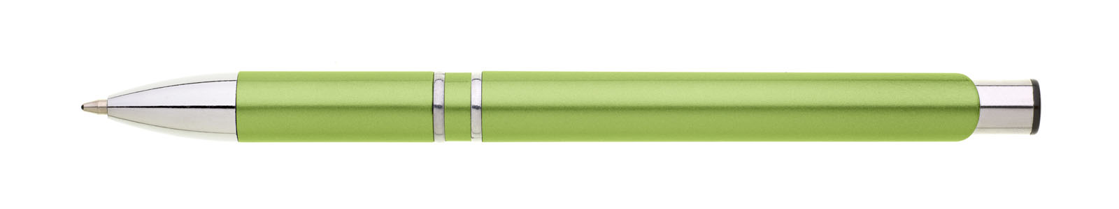 Plastové propisovací pero OIRA - ve světle zelené barvě. Pero je zdobené dvěma stříbrnými proužky. Na těle je zdobeno oválným výřezem. Pero má náplň velkoobsahovou, modře píšící.