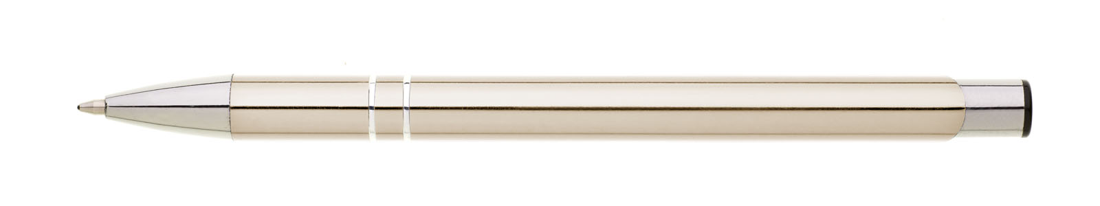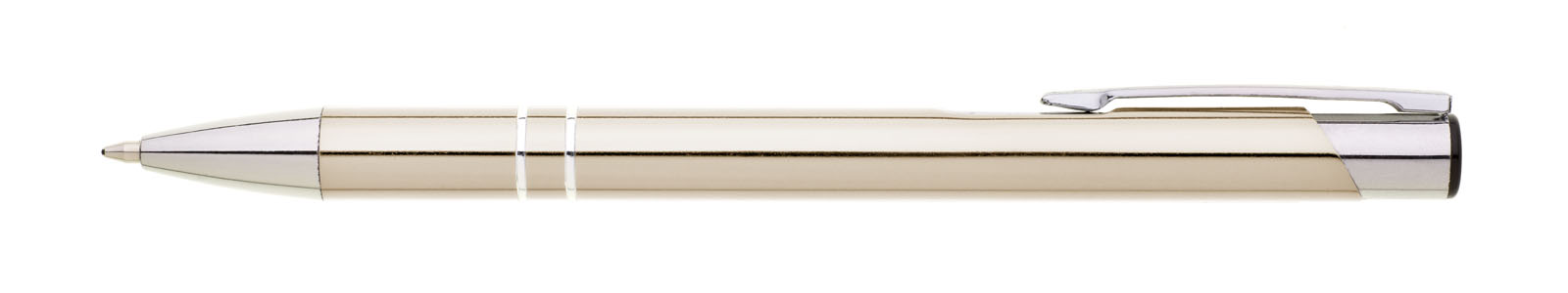 ORIN je velmi oblíbená hliníková reklamní tužka. Lesklé, zlaté tělo se dvěma stříbrnými proužky a chromovými doplňky. Velkoobsahová modrá náplň.