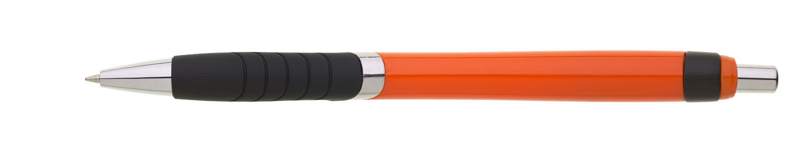 Plastové propisovací pero PEINA oranžové. Pero má černý pogumovaný úchop s vroubky, zakončený stříbrným šikmým poružkem.Klip je včerné barvě. Náplň je X20 , píše modře.