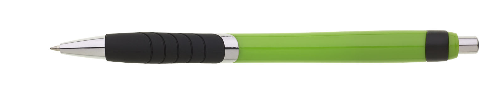 Plastové propisovací pero PEINA světle zelené.Pero má černý pogumovaný úchop s vroubky, zakončený stříbrným šikmým poružkem.Klip je včerné barvě. Náplň je X20 , píše modře.