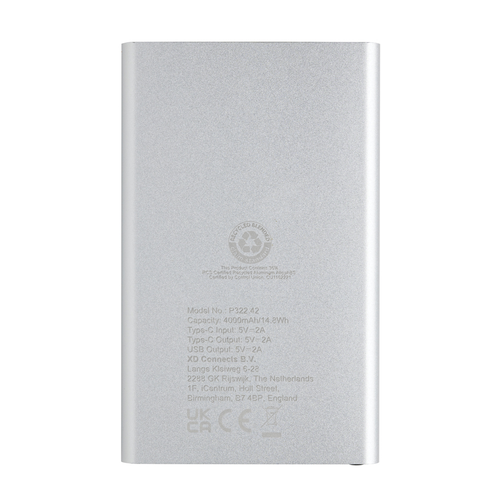 Plochá powerbanka 4 000 mAh vyrobená z recyklovaného hliníku a ABS plastu s RCS certifikací. RCS (Recycled Claim Standard) je globální standard, který umožňuje ověřit použití recyklovaného materiálu v produktu napříč celým dodavatelským řetězcem. Celkový podíl recyklátu dle váhy produktu: 36 %. Kvalitní lithium polymerová baterie řady A s kapacitou 4 000 mAh. Světelné indikátory stupně nabití. USB C vstup: 5V/2A. USB C výstup: 5V/2A, USB A výstup: 5V/2A. Včetně nabíjecího kabelu z recyklovaného TPE. Výrobek je kompletně bez PVC. Baleno v FSC® kraftové dárkové krabičce.