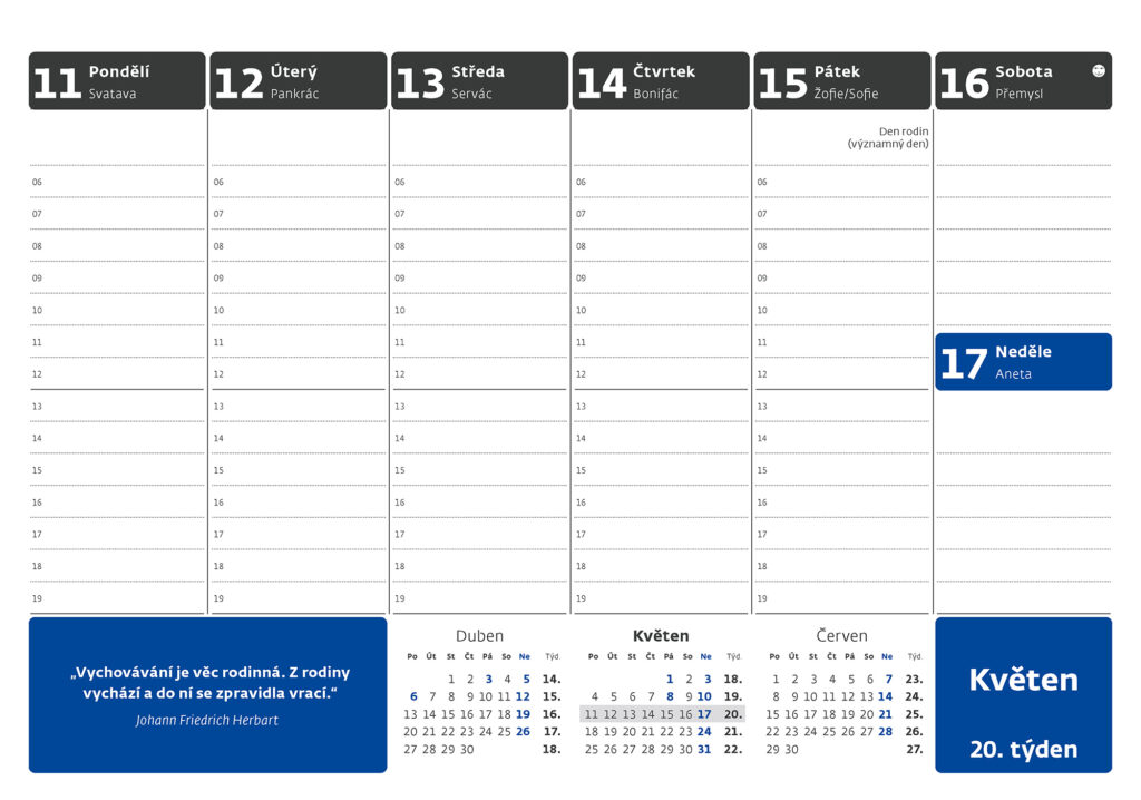 Formát kalendáře: 21,1 x 14,8 cm Kalendárium: české týdenní sloupcové Počet stran kalendáře: 54 + 2 Stojánek: s plným dnem Prostor pro přítisk: 21,1 x 3 cm + roční období, 3měsíční přehled, citáty