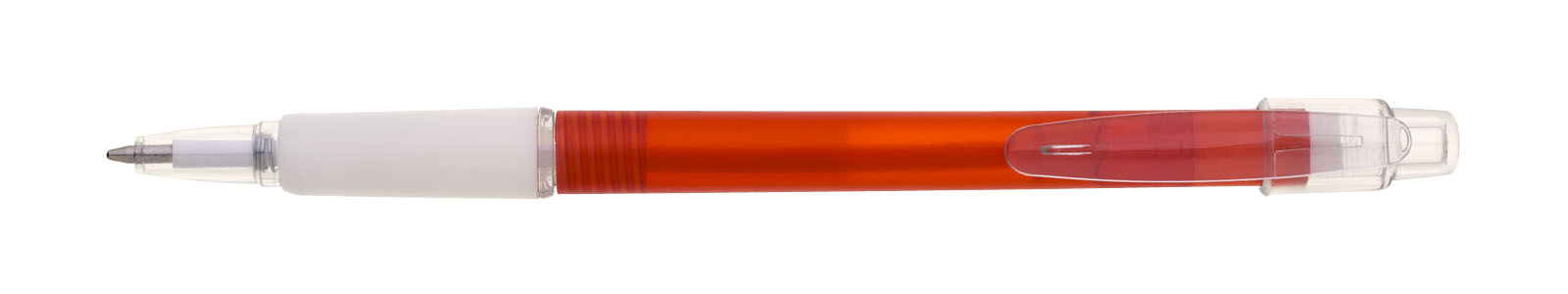 Kuličkové transparentní pero PROSTO. Má gumový úchop, tělo pera je červené. Klip a špička pera je průhledná.Náplň je X20, modře píšící.