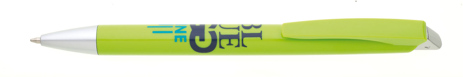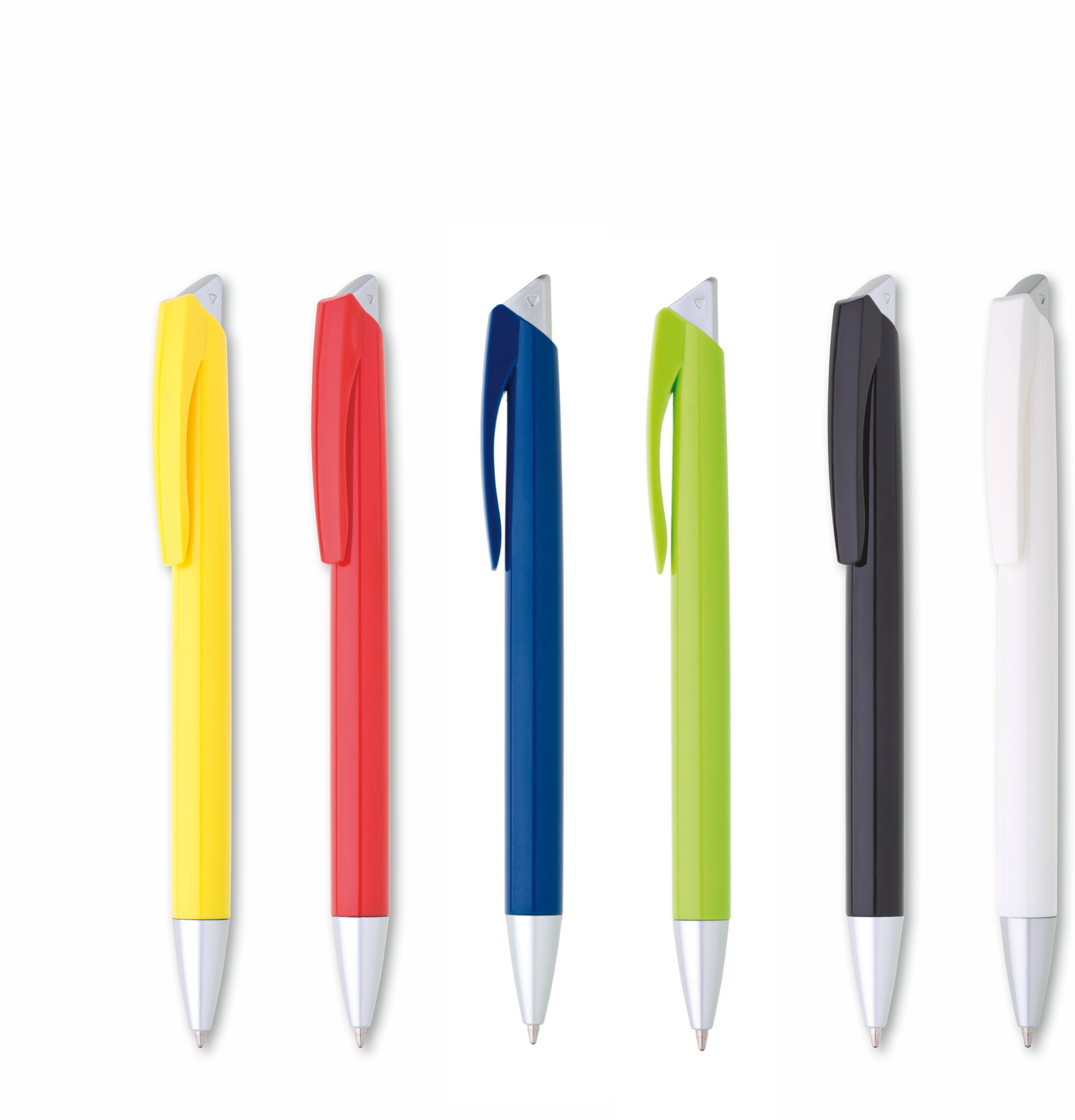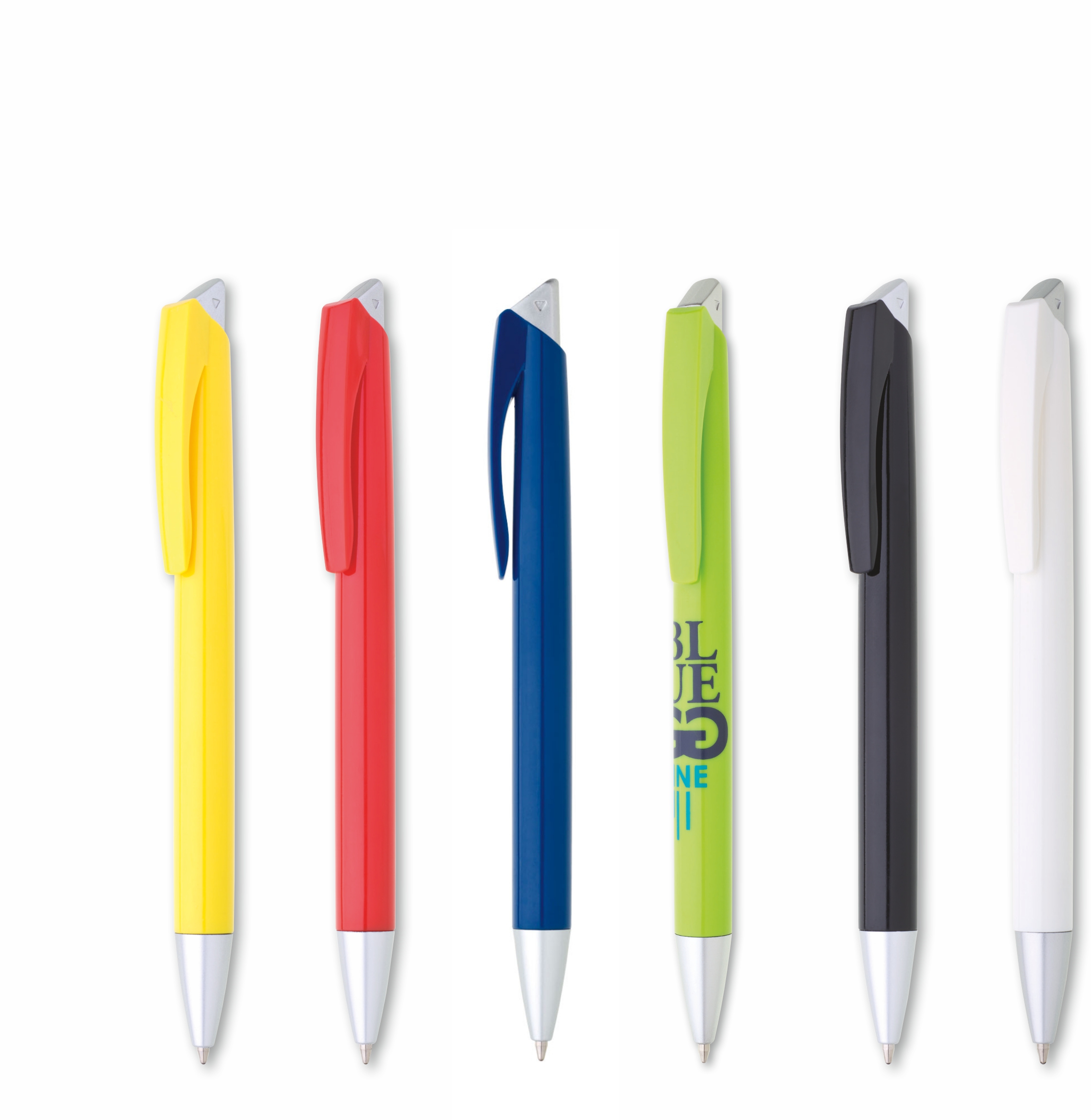 Plastová propiska z kolekce DESIGN, barevné tělo s matnými doplňky s atypickým zapínáním. Náplň velkoobsahová, modře píšící.