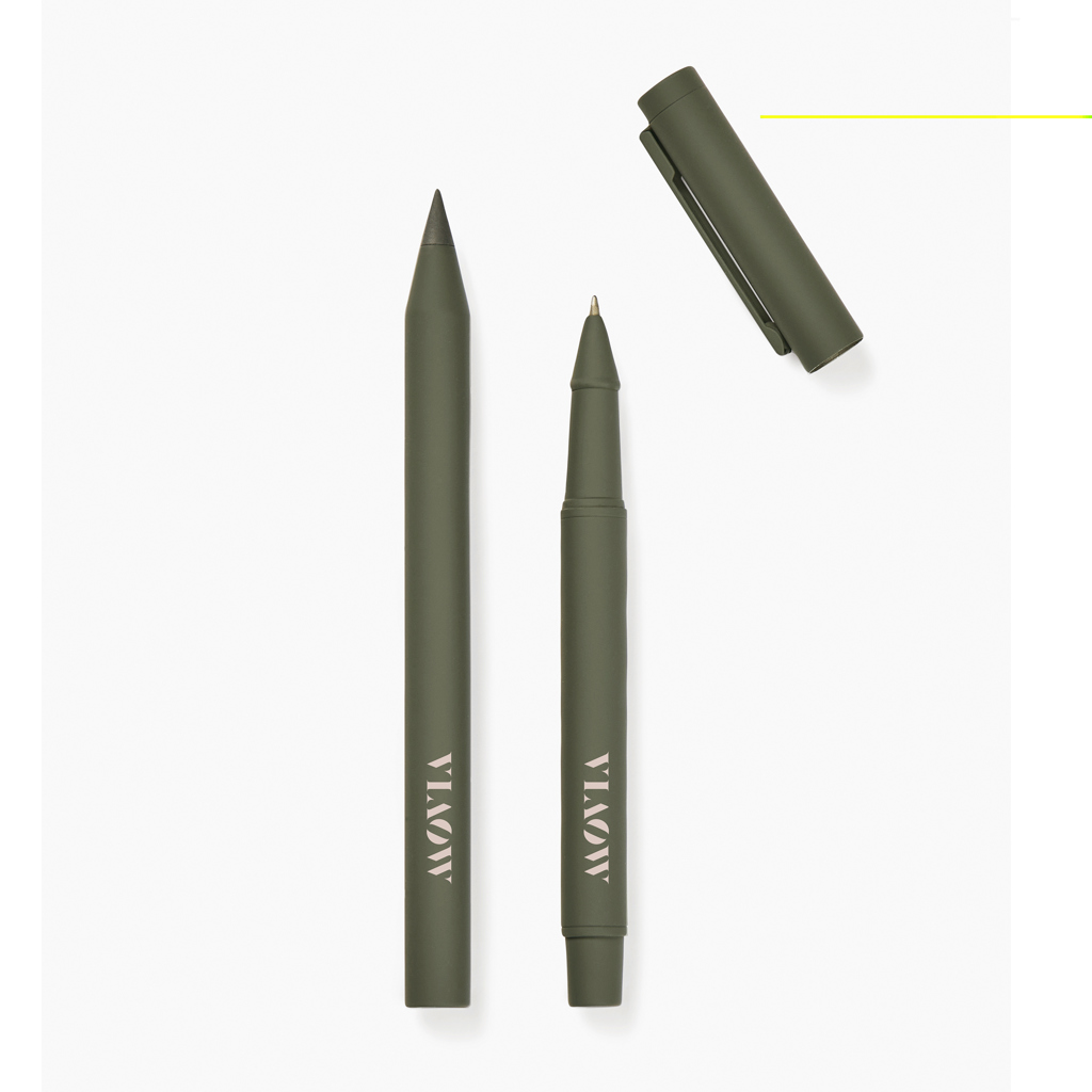 Tato moderní a elegantní sada obsahuje dvě pera: "věčné" pero a klasické kuličkové pero. Pera jsou vyrobena z recyklované nerezové oceli s certifikátem RCS, mají pogumovaný povrch pro pohodlný úchop a matnou povrchovou úpravu. Obě pera mají vyváženou hmotnost, která zajišťuje stabilitu a psaní bez námahy. "Věčné" pero nabízí neomezené psaní. Kuličkové pero je vybaveno jemným hrotem o průměru 1,00 mm a poskytuje hladké a konzistentní psaní modrým inkoustem s výdrží až 1200 metrů. Certifikace RCS zaručuje, že celý dodavatelský řetězec recyklovaných materiálů je certifikován. Celkový obsah recyklovaných materiálů se odvíjí od celkové hmotnosti výrobku. Tento výrobek obsahuje 52 % recyklovaného hliníku s certifikací RCS a 10 % nerezové oceli s certifikací RCS.