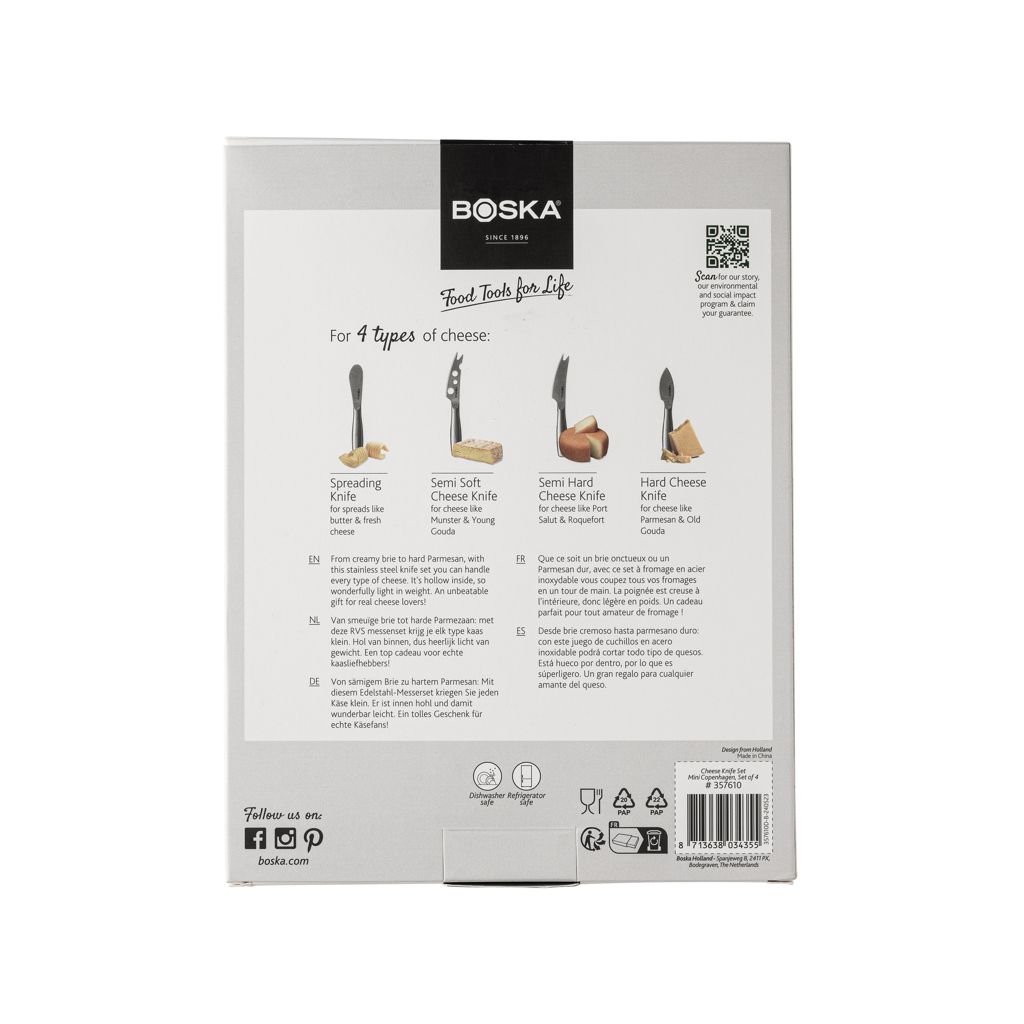 Sada nožů na sýr BOSKA Mini Copenhagen obsahuje čtyři nerezové nože pro krájení všech druhů sýrů - tvrdých, měkkých i roztíratelných. Lze je mýt v myčce a skladovat v lednici. Na výrobek je doživotní záruka.