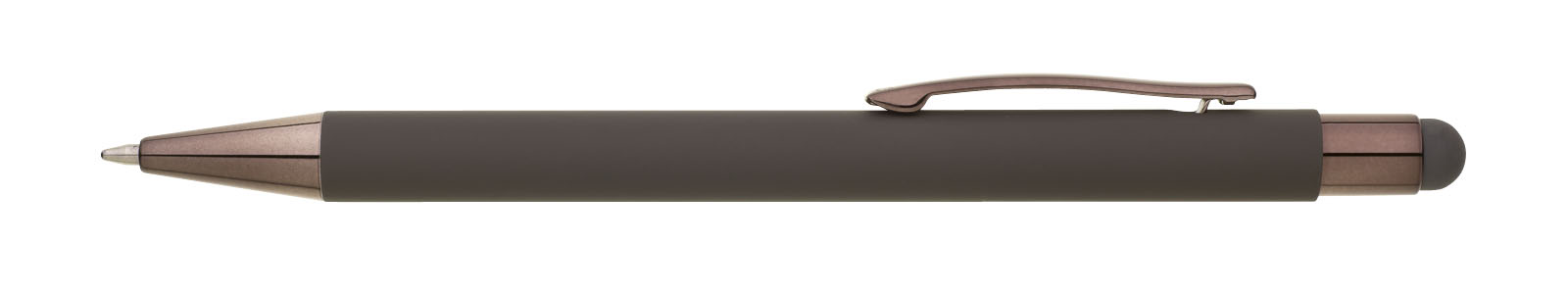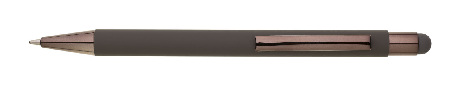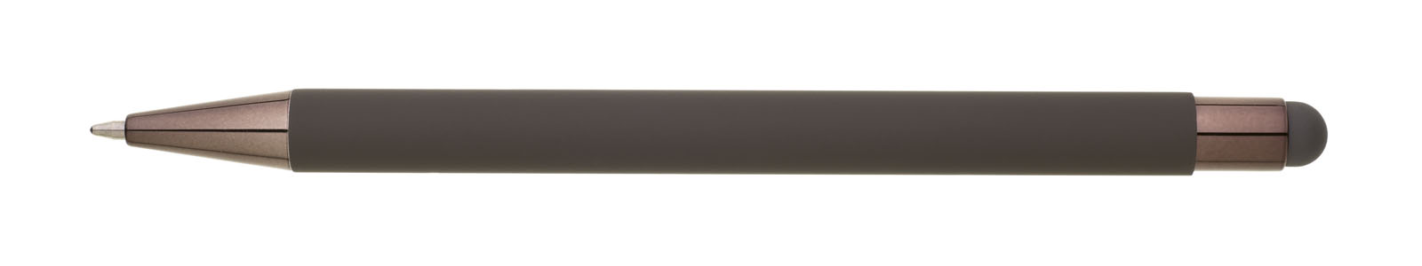 Šedé pogumované matné tělo propisky doplňují lesklé doplňky v barvě těla a matný touch konec. Logo po vylaserování je lesklé stříbrné. Velkoobsahová modře píšící náplň.