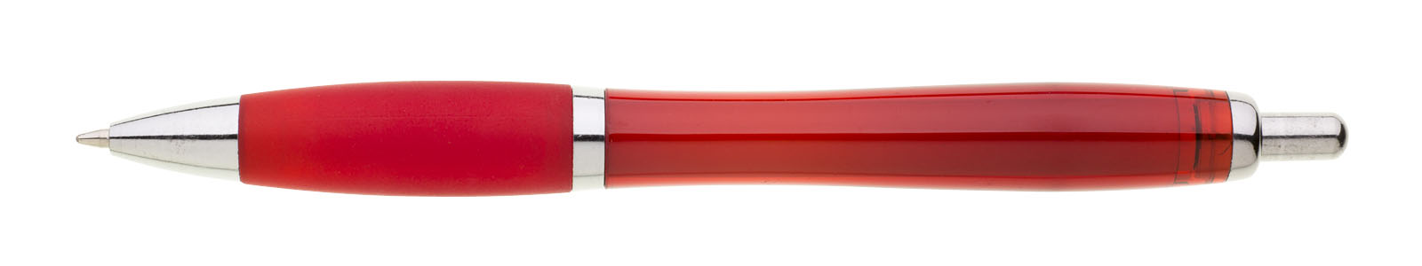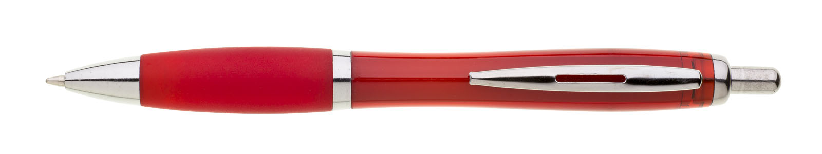 Oblíbené plastové propisovací pero ULTA s celobarevným, transparentním, čerevným tělem. Barva pogumovaného úchopu je stejná jako tělo. Pero je zdobené stříbrným proužkem, ostatní doplňky jsou také stříbrné. Náplň je velkoobsahová, modře píšící. Kolekce EV