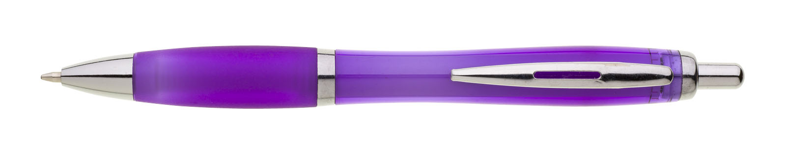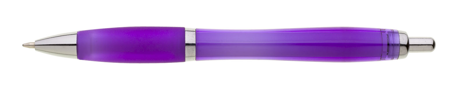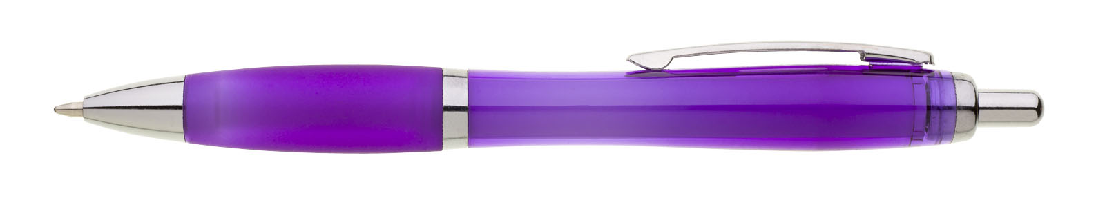 Oblíbené plastové propisovací pero ULTA s celobarevným, transparentním, fialovým tělem. Barva pogumovaného úchopu je stejná jako tělo. Pero je zdobené stříbrným proužkem, ostatní doplňky jsou také stříbrné. Náplň je velkoobsahová, modře píšící. Kolekce EV