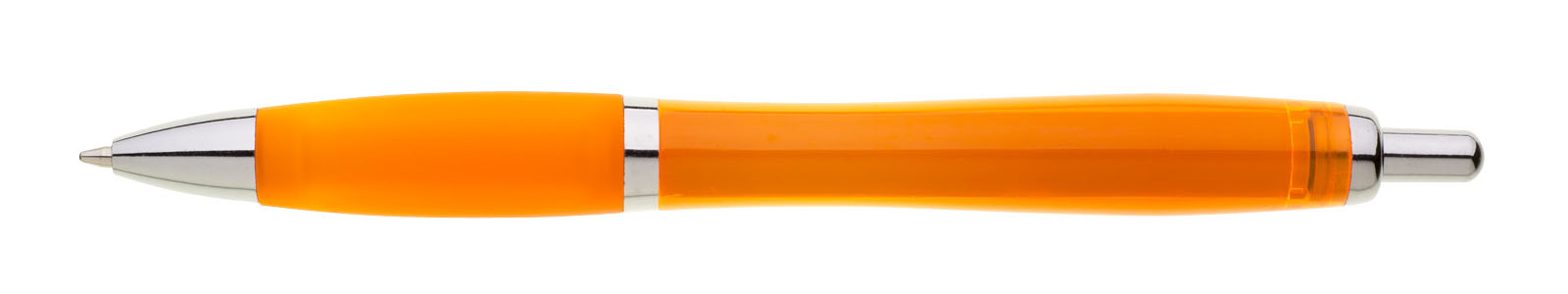 Oblíbené plastové propisovací pero ULTA s celobarevným, transparentním, oranžovým tělem. Barva pogumovaného úchopu je stejná jako tělo. Pero je zdobené stříbrným proužkem, ostatní doplňky jsou také stříbrné. Náplň je velkoobsahová, modře píšící.