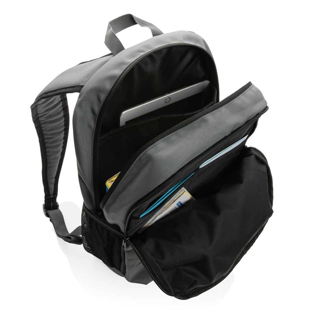 Základní batoh pro každou příležitost z kolekce Impact. Nabízí spoustu místa v hlavní části na zip včetně oddílu pro 15" notebook. Prostřední oddíl s 2 otevřenými kapsami, přední oddíl na zip pro rychlý přístup k drobnostem. Pohodlné ramenní popruhy, 2 vnější síťové kapsy na lahev. Ideální pro přenos sportovních věcí nebo na turistiku. Vnější část vyrobena ze 100 % recyklovaného polyesteru 300D, podšívka ze 100 % recyklovaného polyesteru 150D. Včetně skenovatelné složky AWARE™ garantující obsah recyklátu. Na výrobu bylo využito 15,39 500ml PET lahví a bylo uspořeno 9,2 litrů vody. Z výtěžku každého prodaného produktu z kolekce Impact je navíc přispěno 2 % na podporu iniciativy Water.org.
