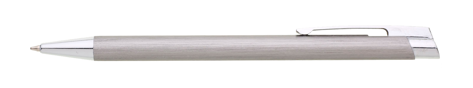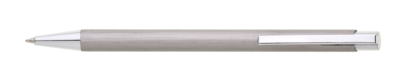 Šedá kovová propiska s jemně rýhovaným povrchem.